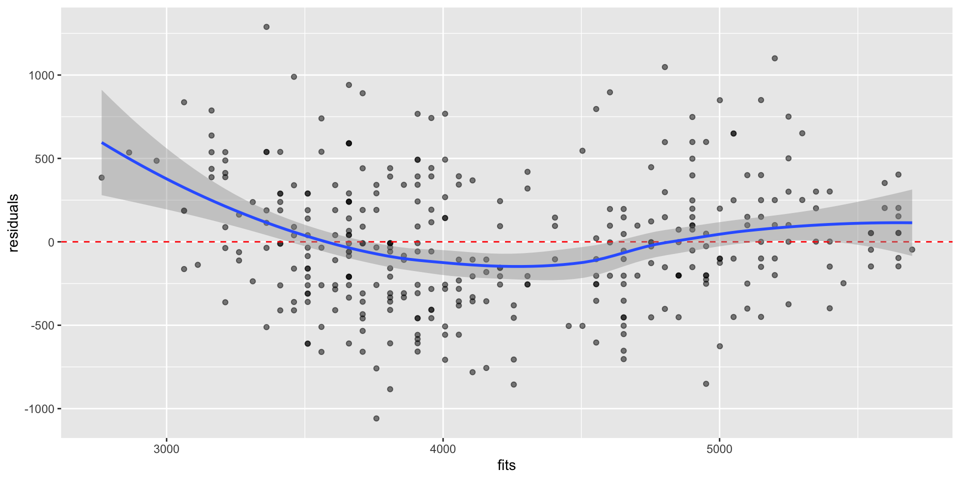 Plot residuals against \(\hat{Y}_i\), residuals vs fit plot