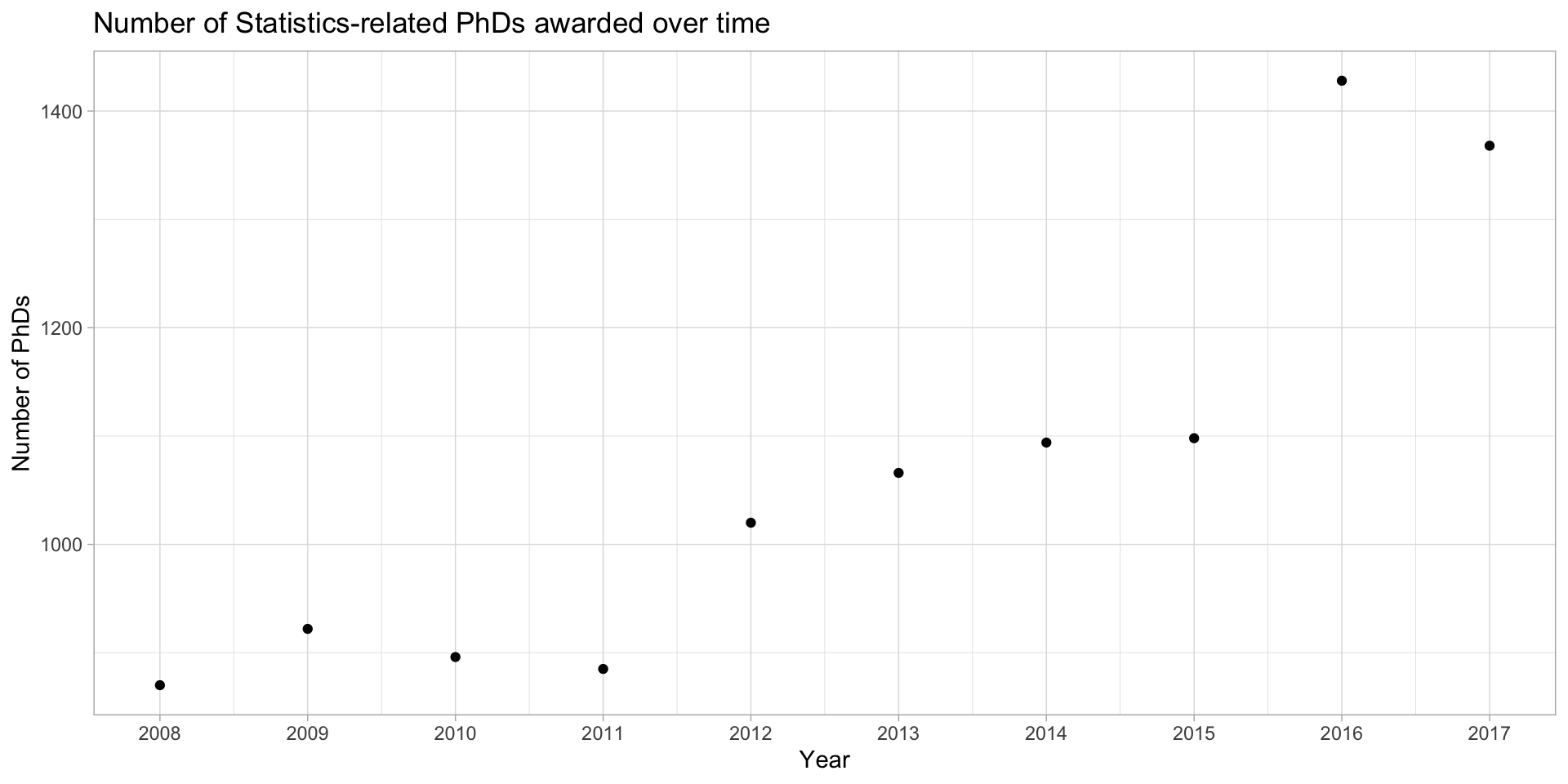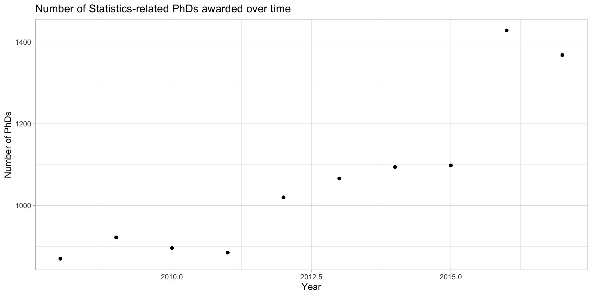 stat_phd_year_summary |>ggplot(aes(x = year, y = n_phds)) +geom_point() +scale_x_continuous(breaks =unique(stat_phd_year_summary$year), labels =unique(stat_phd_year_summary$year)) +theme_light() +labs(x ="Year", y ="Number of PhDs", title ="Number of Statistics-related PhDs awarded over time")