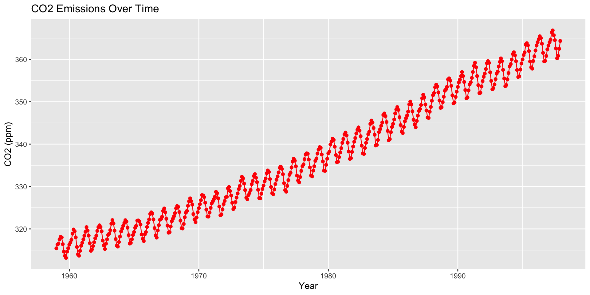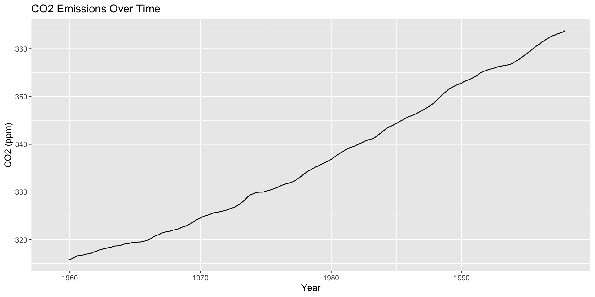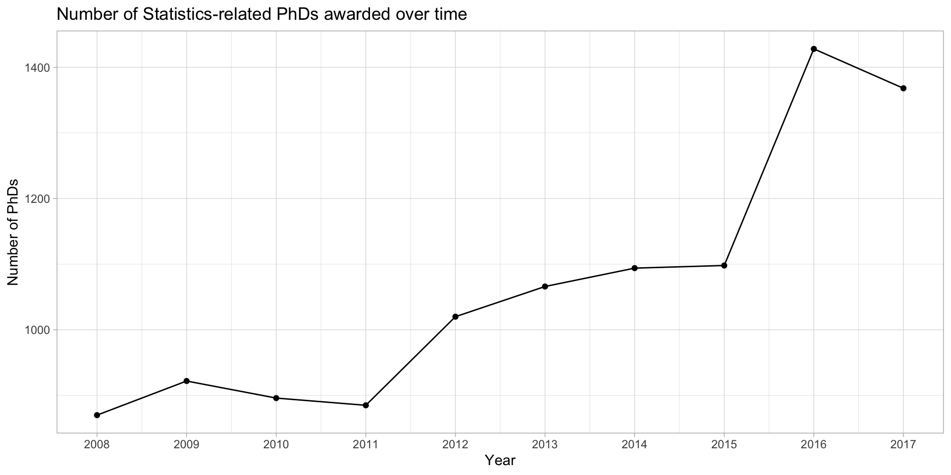 stat_phd_year_summary |>ggplot(aes(x = year, y = n_phds)) +geom_point() +geom_line() +scale_x_continuous(breaks =unique(stat_phd_year_summary$year),labels =unique(stat_phd_year_summary$year)) +theme_light() +labs(x ="Year", y ="Number of PhDs",title ="Number of Statistics-related PhDs awarded over time")