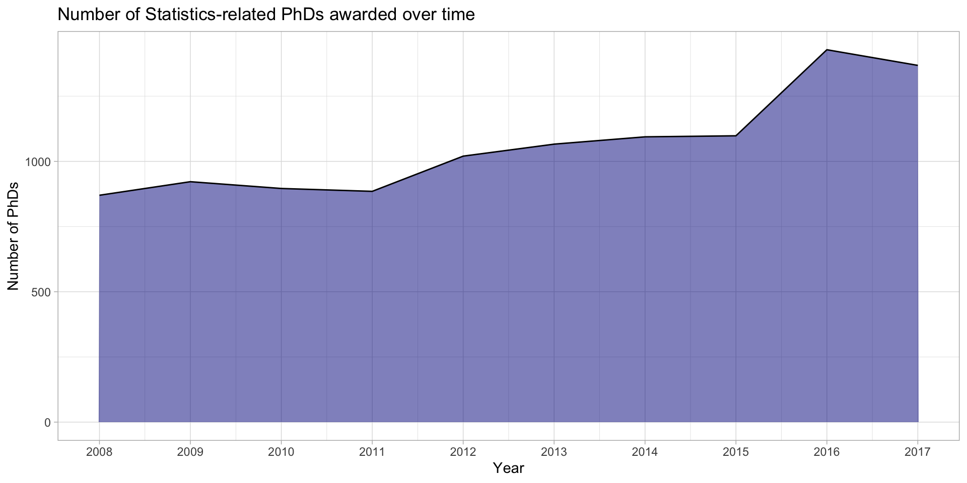 stat_phd_year_summary |>ggplot(aes(x = year, y = n_phds)) +geom_area(fill ="darkblue", alpha =0.5) +geom_line() +scale_x_continuous(breaks =unique(stat_phd_year_summary$year),labels =unique(stat_phd_year_summary$year)) +theme_light() +labs(x ="Year", y ="Number of PhDs",title ="Number of Statistics-related PhDs awarded over time")