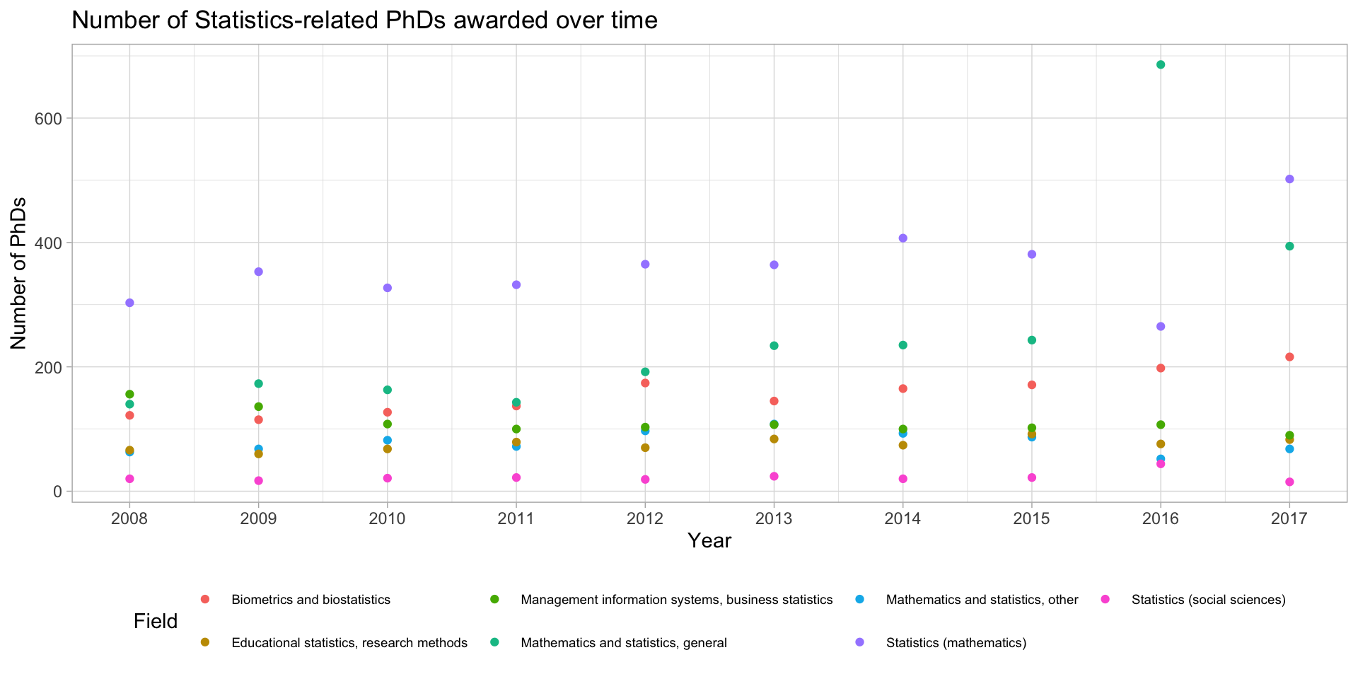 stats_phds |>ggplot(aes(x = year, y = n_phds, color = field)) +geom_point() +scale_x_continuous(breaks =unique(stat_phd_year_summary$year),labels =unique(stat_phd_year_summary$year)) +theme_light() +theme(legend.position ="bottom", legend.text =element_text(size =7)) +labs(x ="Year", y ="Number of PhDs",title ="Number of Statistics-related PhDs awarded over time",color ="Field")