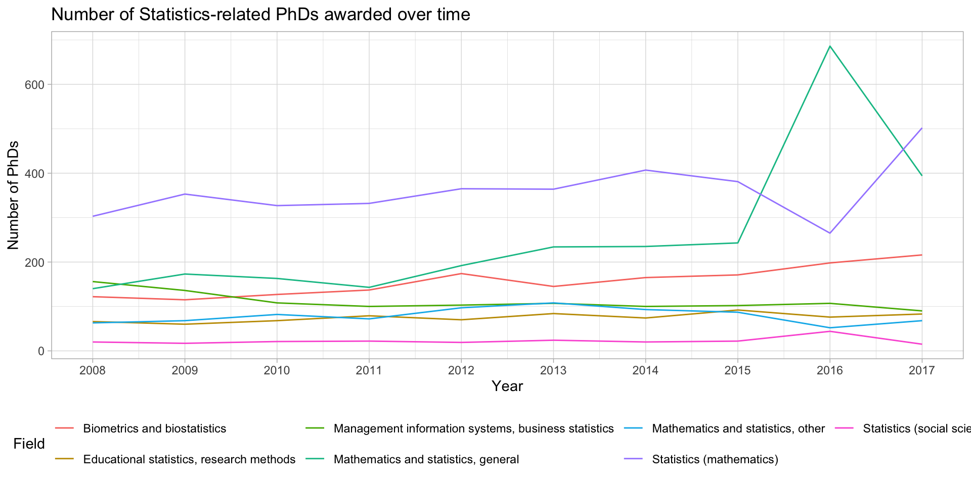 stats_phds |>ggplot(aes(x = year, y = n_phds, color = field)) +geom_line() +scale_x_continuous(breaks =unique(stat_phd_year_summary$year),labels =unique(stat_phd_year_summary$year)) +theme_light() +theme(legend.position ="bottom") +labs(x ="Year", y ="Number of PhDs", color ="Field",title ="Number of Statistics-related PhDs awarded over time")