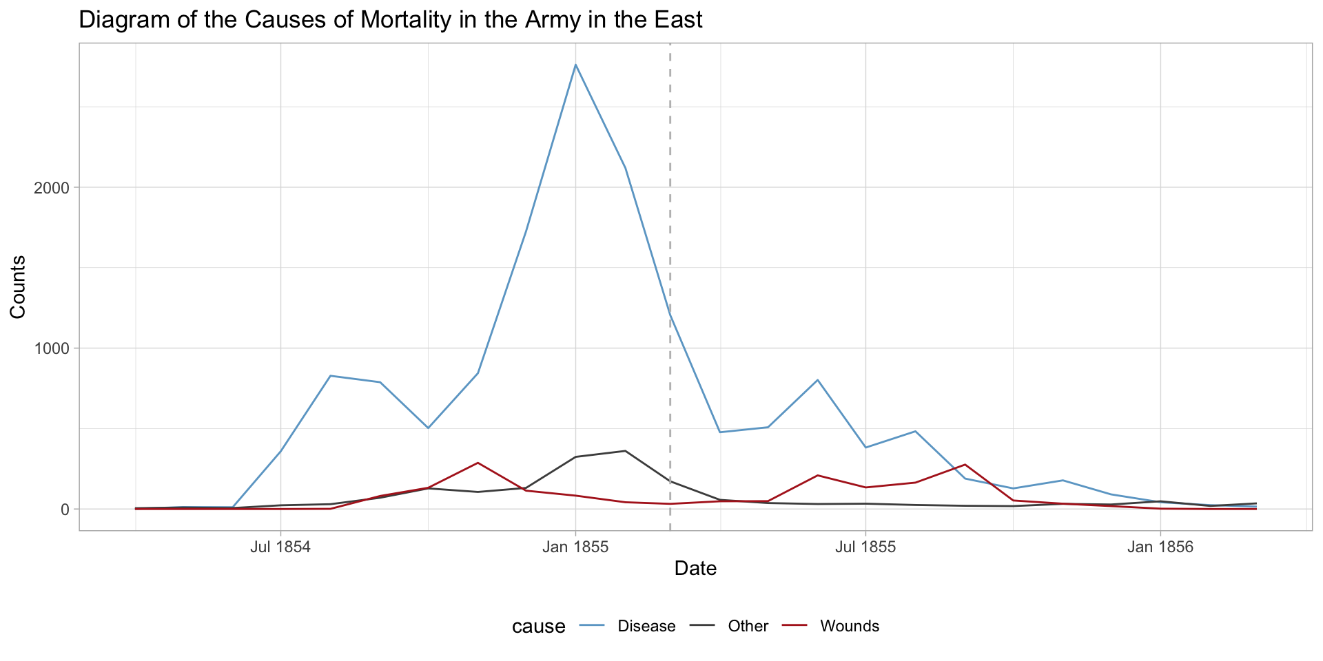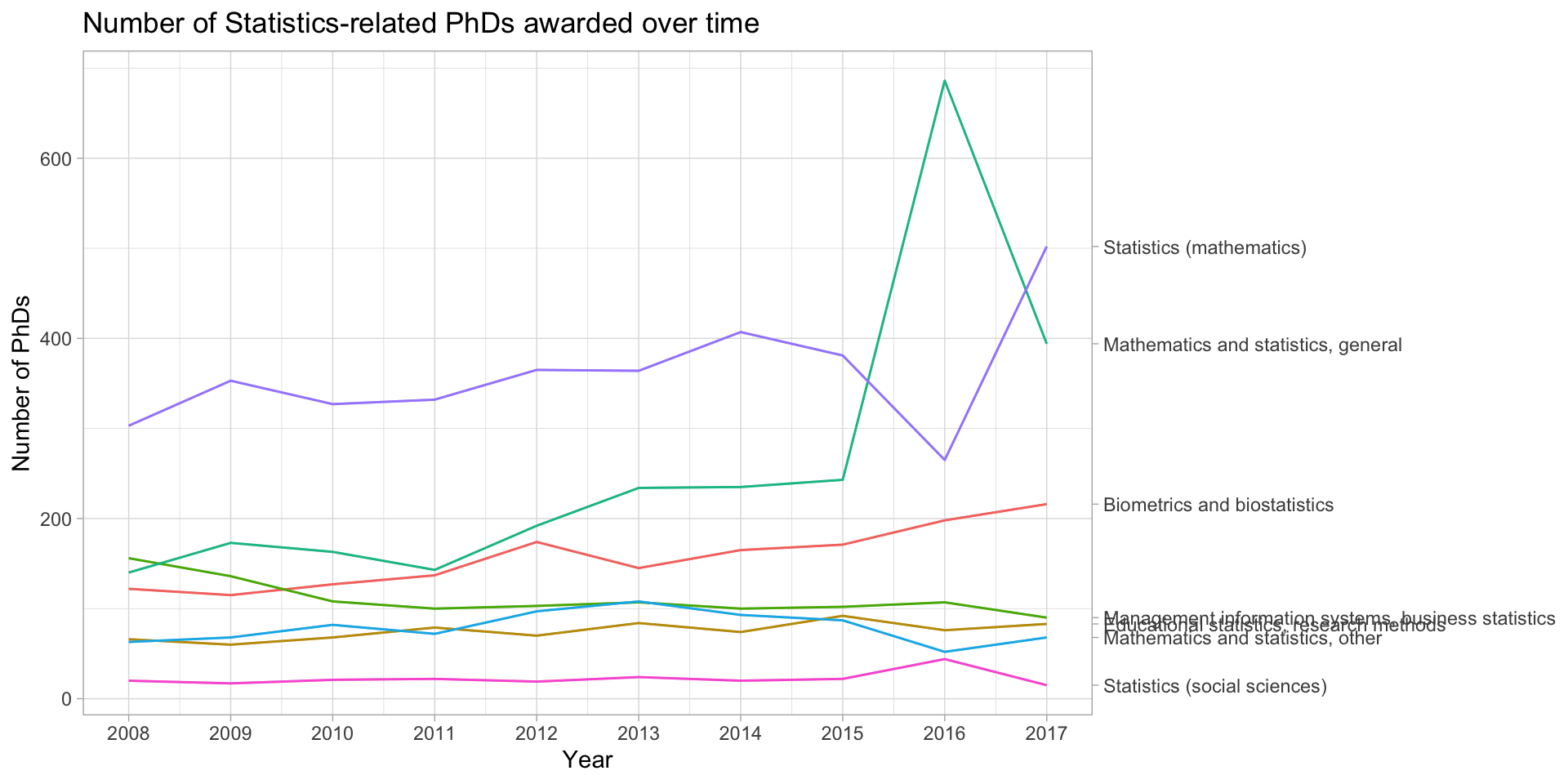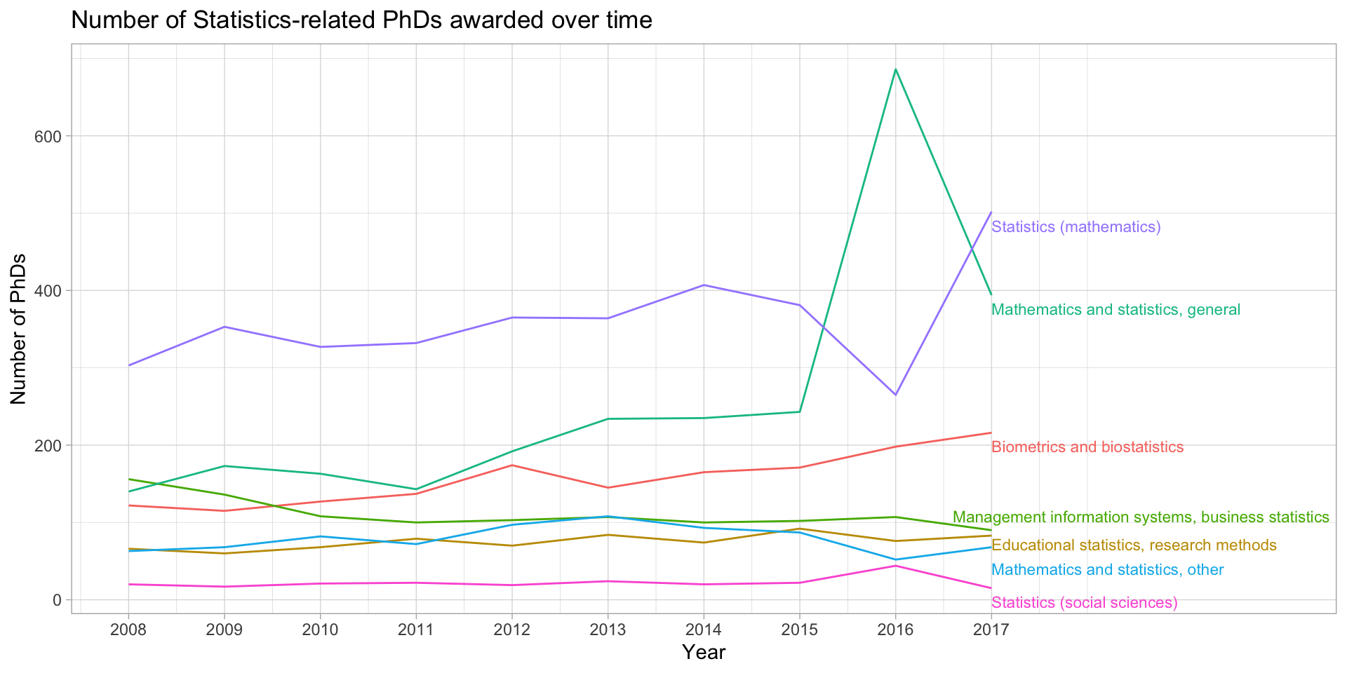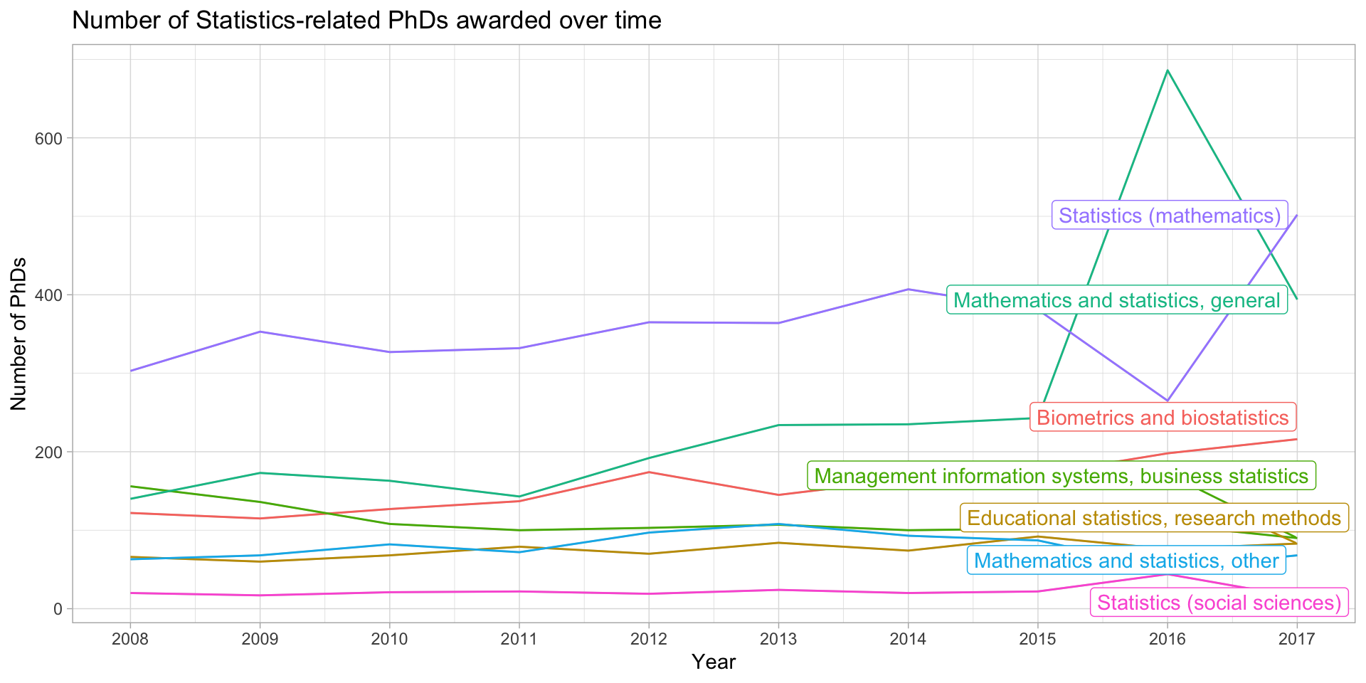 stats_phds_2017 <- stats_phds |>filter(year ==2017)library(ggrepel)stats_phds |>ggplot(aes(x = year, y = n_phds, color = field)) +geom_line() +# Add the labels:geom_text_repel(data = stats_phds_2017, aes(label = field),size =3, # Drop the segment connection:segment.color =NA, # Move labels up or down based on overlapdirection ="y",# Try to align the labels horizontally on the left hand sidehjust ="left") +scale_x_continuous(breaks =unique(stat_phd_year_summary$year),labels =unique(stat_phd_year_summary$year),# Update the limits so that there is some padding on the# x-axis but don't label the new maximumlimits =c(min(stat_phd_year_summary$year),max(stat_phd_year_summary$year) +3)) +theme_light() +theme(legend.position ="none") +labs(x ="Year", y ="Number of PhDs", color ="Field",title ="Number of Statistics-related PhDs awarded over time")