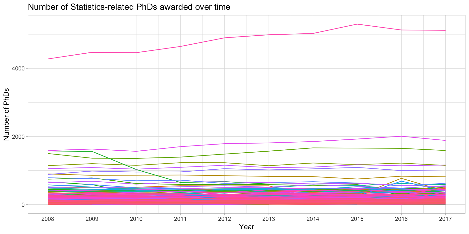 phd_field |>ggplot(aes(x = year, y = n_phds, color = field)) +geom_line() +scale_x_continuous(breaks =unique(stat_phd_year_summary$year),labels =unique(stat_phd_year_summary$year)) +theme_light() +theme(legend.position ="none") +labs(x ="Year", y ="Number of PhDs", color ="Field",title ="Number of Statistics-related PhDs awarded over time")