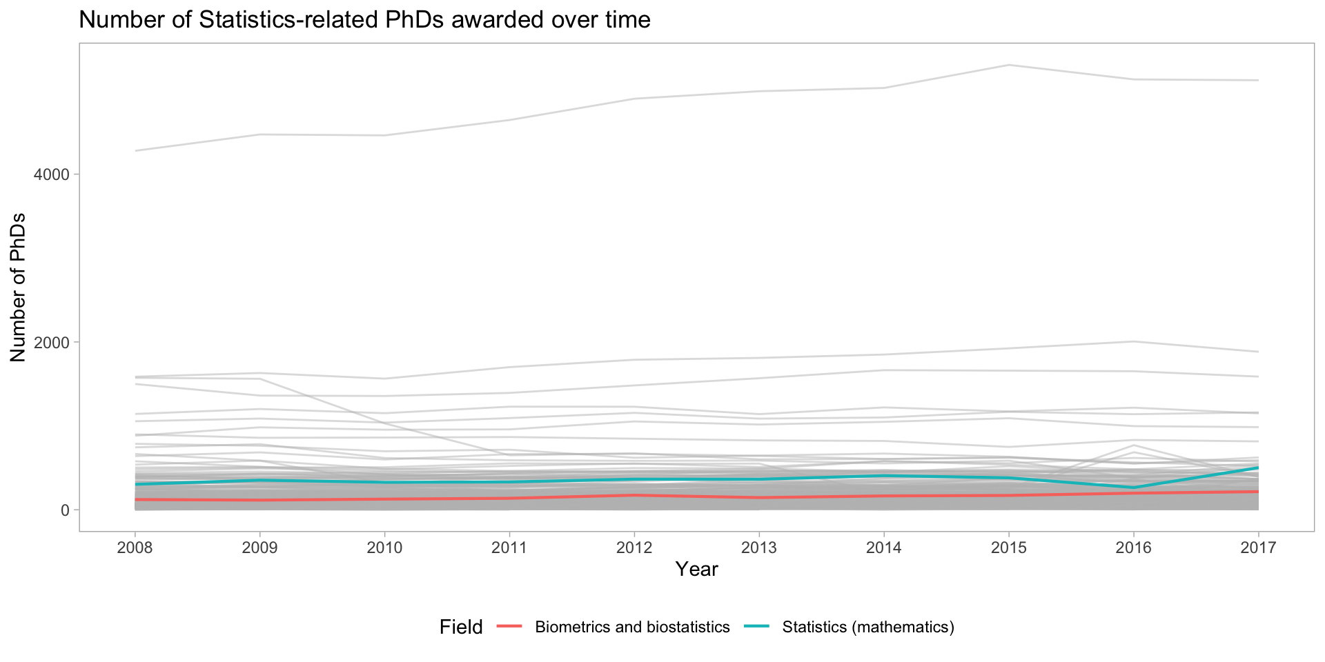 phd_field |>filter(!(field %in%c("Biometrics and biostatistics", "Statistics (mathematics)"))) |>ggplot() +# Add the background lines - need to specify the group to be the fieldgeom_line(aes(x = year, y = n_phds, group = field),color ="gray", size = .5, alpha = .5) +# Now add the layer with the lines of interest:geom_line(data =filter(phd_field,# Note this is just the opposite of the above since ! is removed field %in%c("Biometrics and biostatistics", "Statistics (mathematics)")),aes(x = year, y = n_phds, color = field),# Make the size largersize = .75, alpha =1) +scale_x_continuous(breaks =unique(stat_phd_year_summary$year),labels =unique(stat_phd_year_summary$year)) +theme_light() +theme(legend.position ="bottom", # Drop the panel lines making the gray difficult to seepanel.grid =element_blank()) +labs(x ="Year", y ="Number of PhDs", color ="Field",title ="Number of Statistics-related PhDs awarded over time")