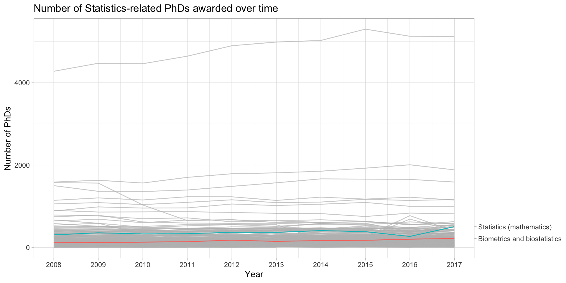phd_field |>ggplot(aes(x = year, y = n_phds, color = field)) +geom_line() +gghighlight(field %in%c("Biometrics and biostatistics", "Statistics (mathematics)"),line_label_type ="sec_axis") +scale_x_continuous(breaks =unique(stat_phd_year_summary$year),labels =unique(stat_phd_year_summary$year)) +theme_light() +theme(legend.position ="none") +labs(x ="Year", y ="Number of PhDs", color ="Field",title ="Number of Statistics-related PhDs awarded over time")