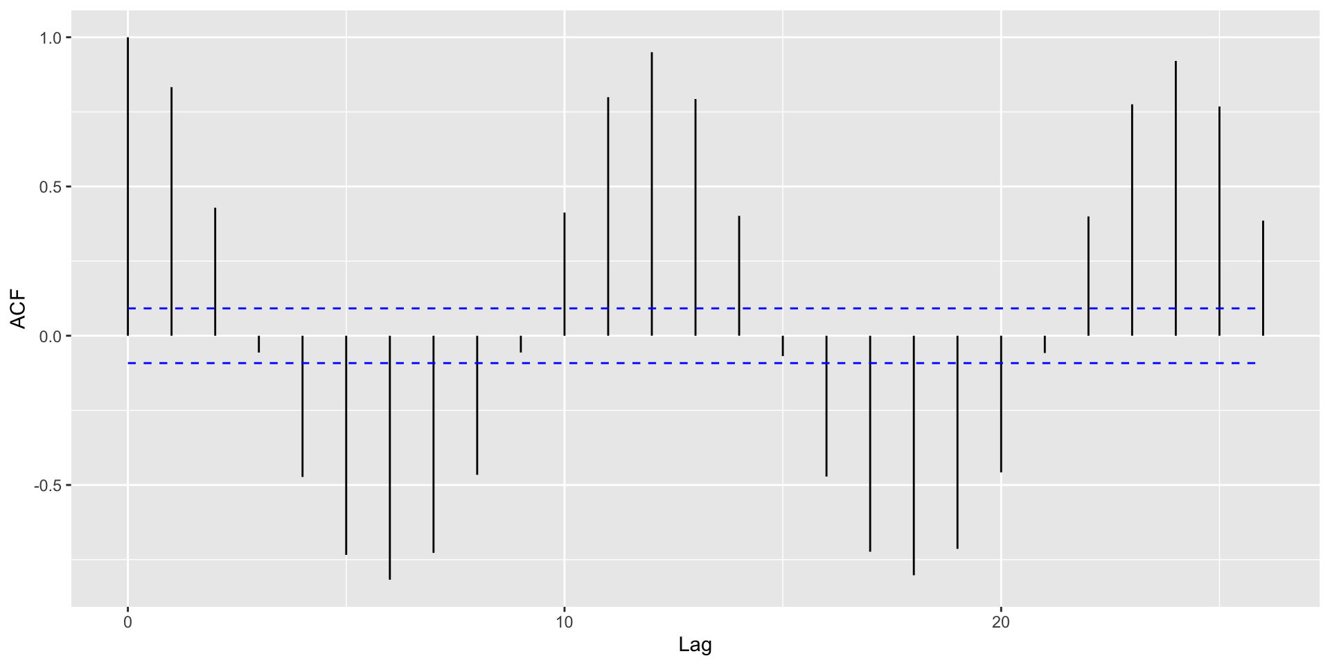 To make an autocorrelation plot, we use the acf() function; the ggplot version uses autoplot()