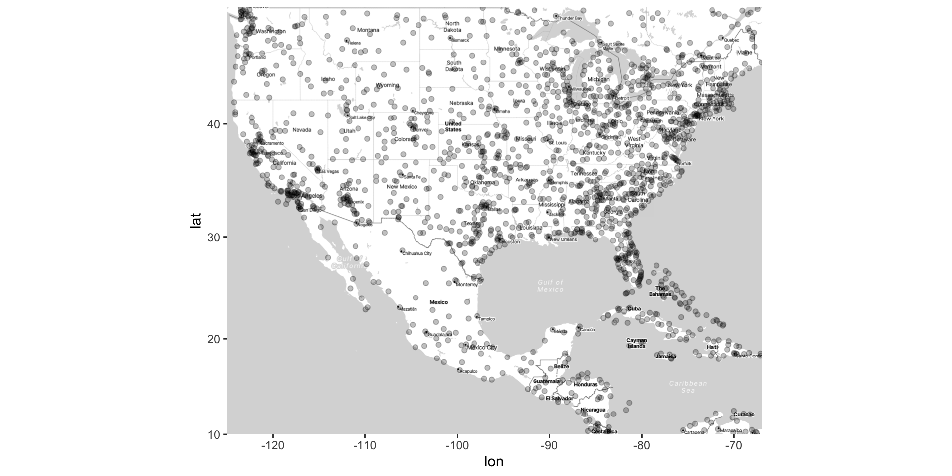 Again, latitude and longitude are represented with dots, sometimes called a dot or bubble map.