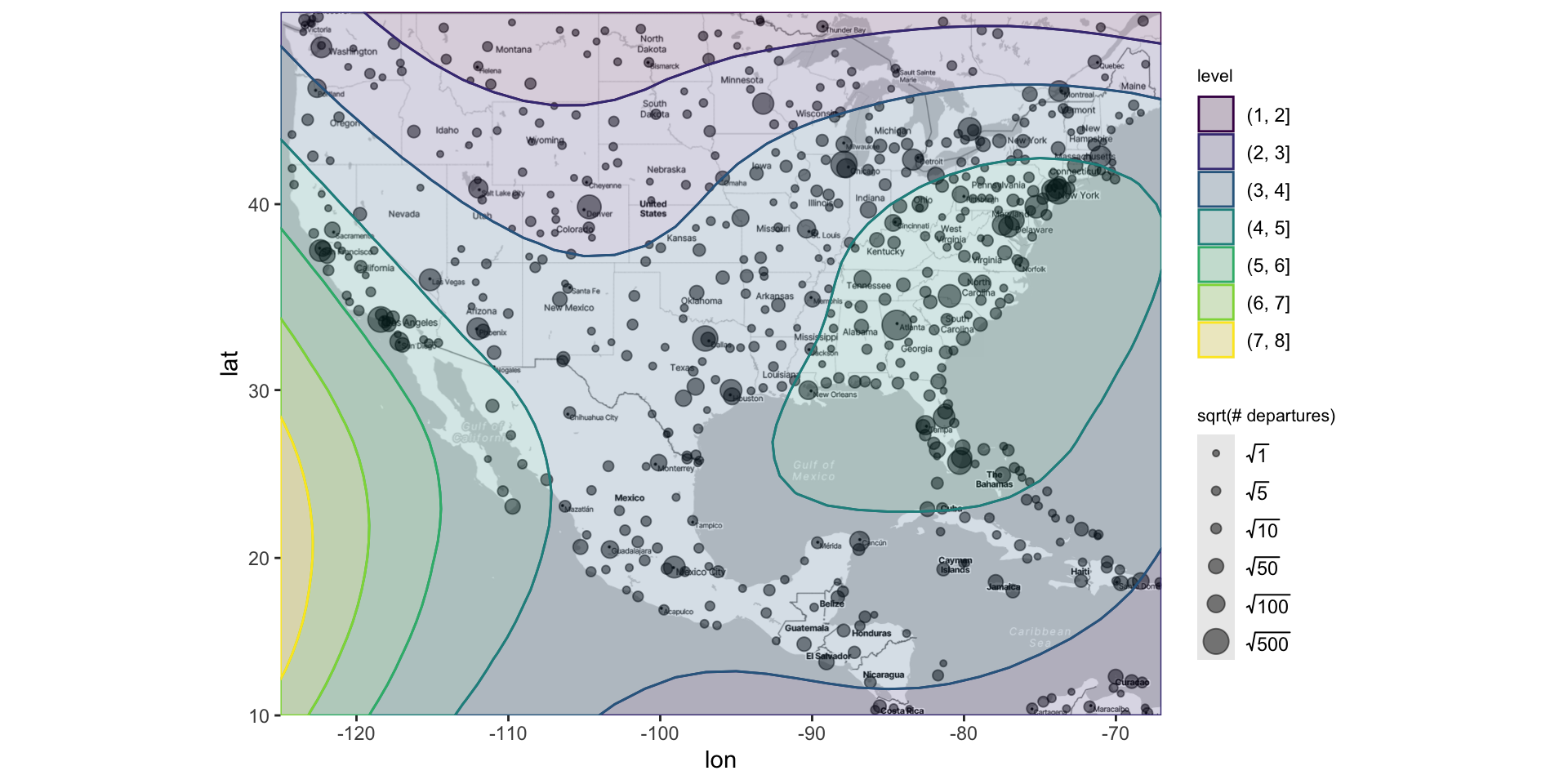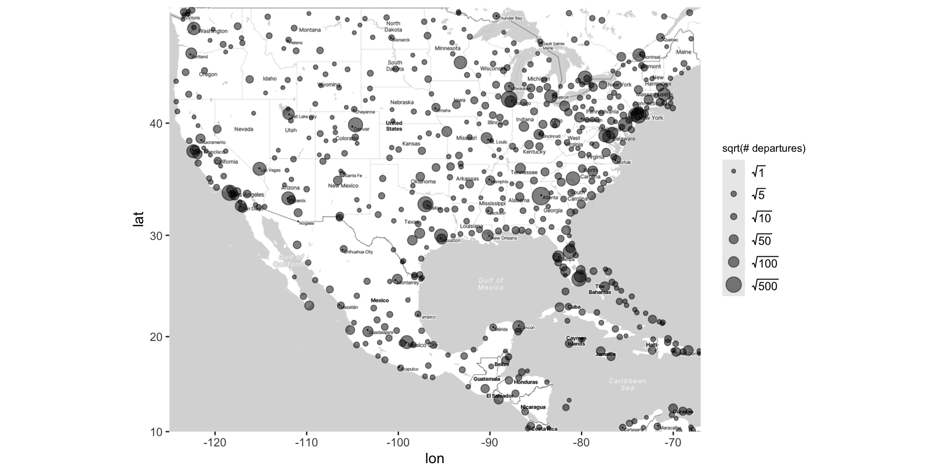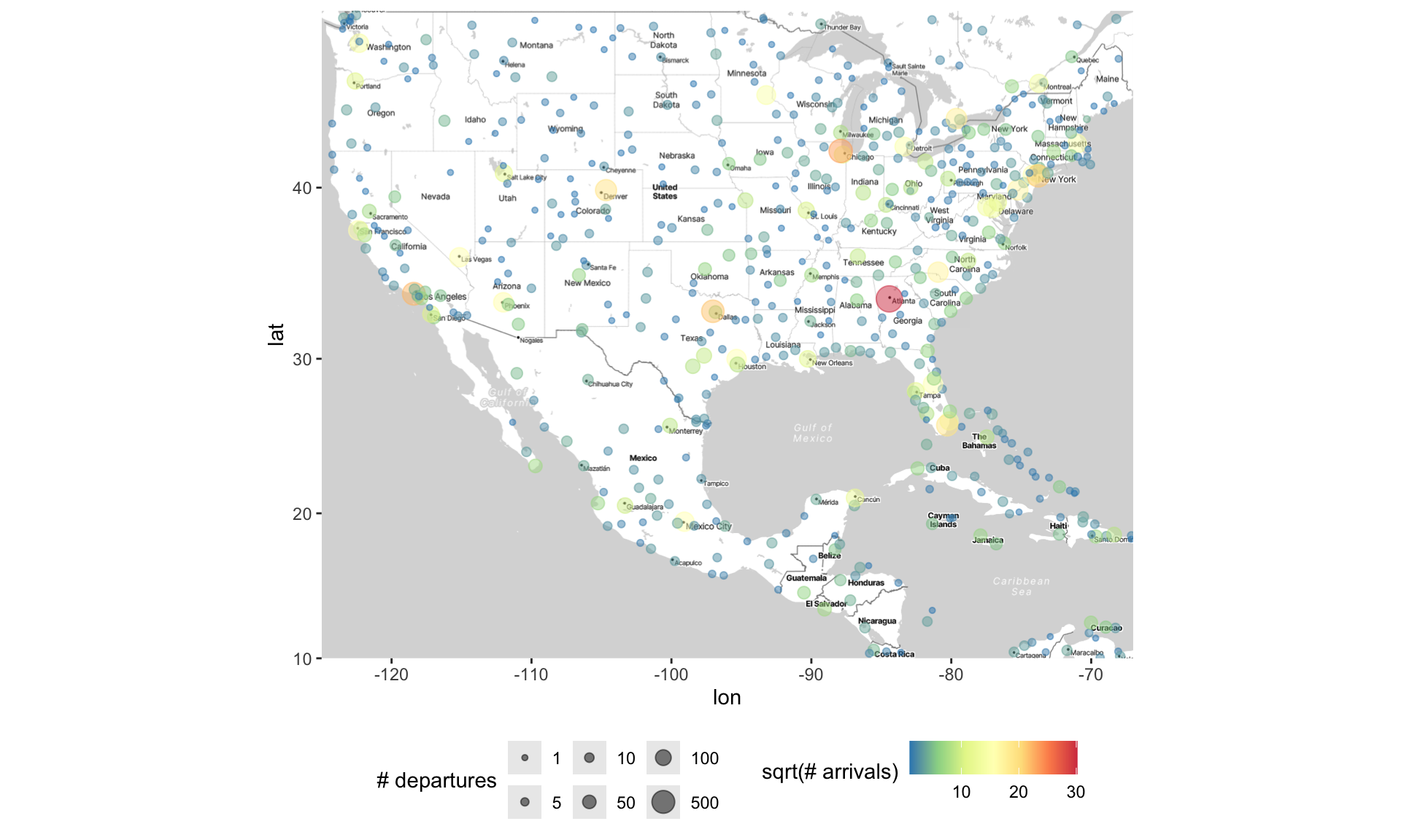 size = sqrt(n_depart), color = sqrt(n_arrive)),