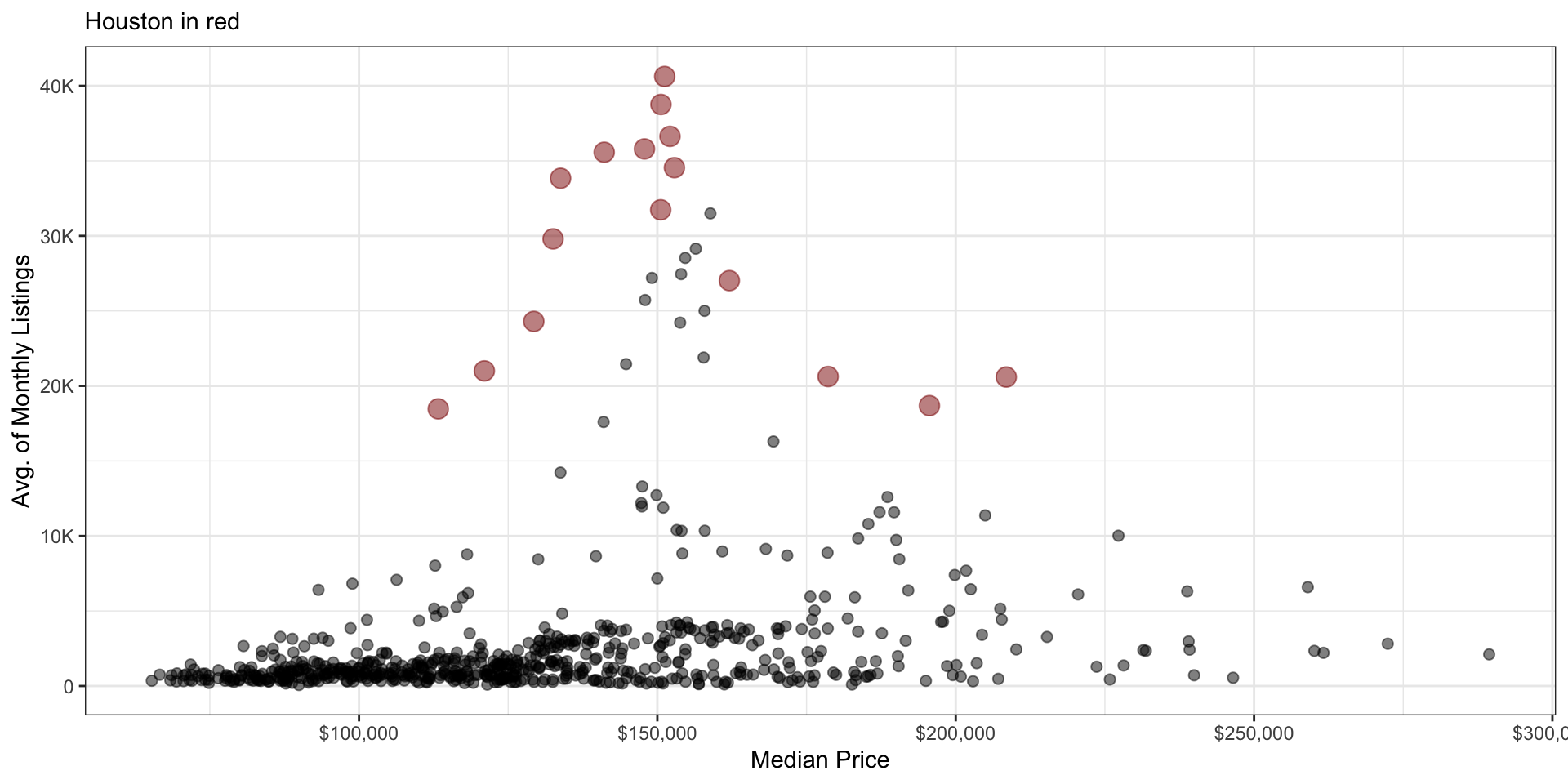 labs(x = "Median Price", y = "Avg. of Monthly Listings",